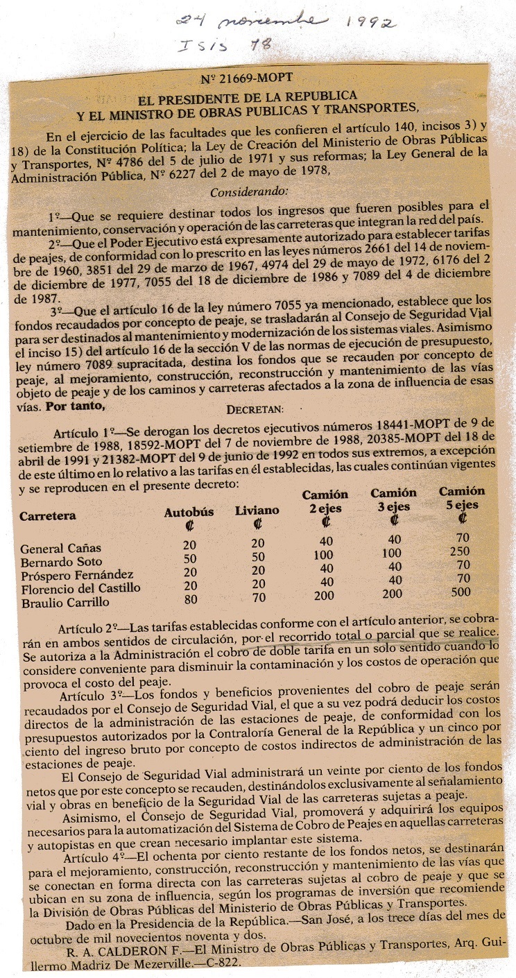 Se derogan los Decretos Ejecutivos Nos.18441 MOPT, 18592 MOPT, 20385 MOPT, 21382 MOPT,Publicado en La Gaceta no. 226, 24 noviembre de 1992